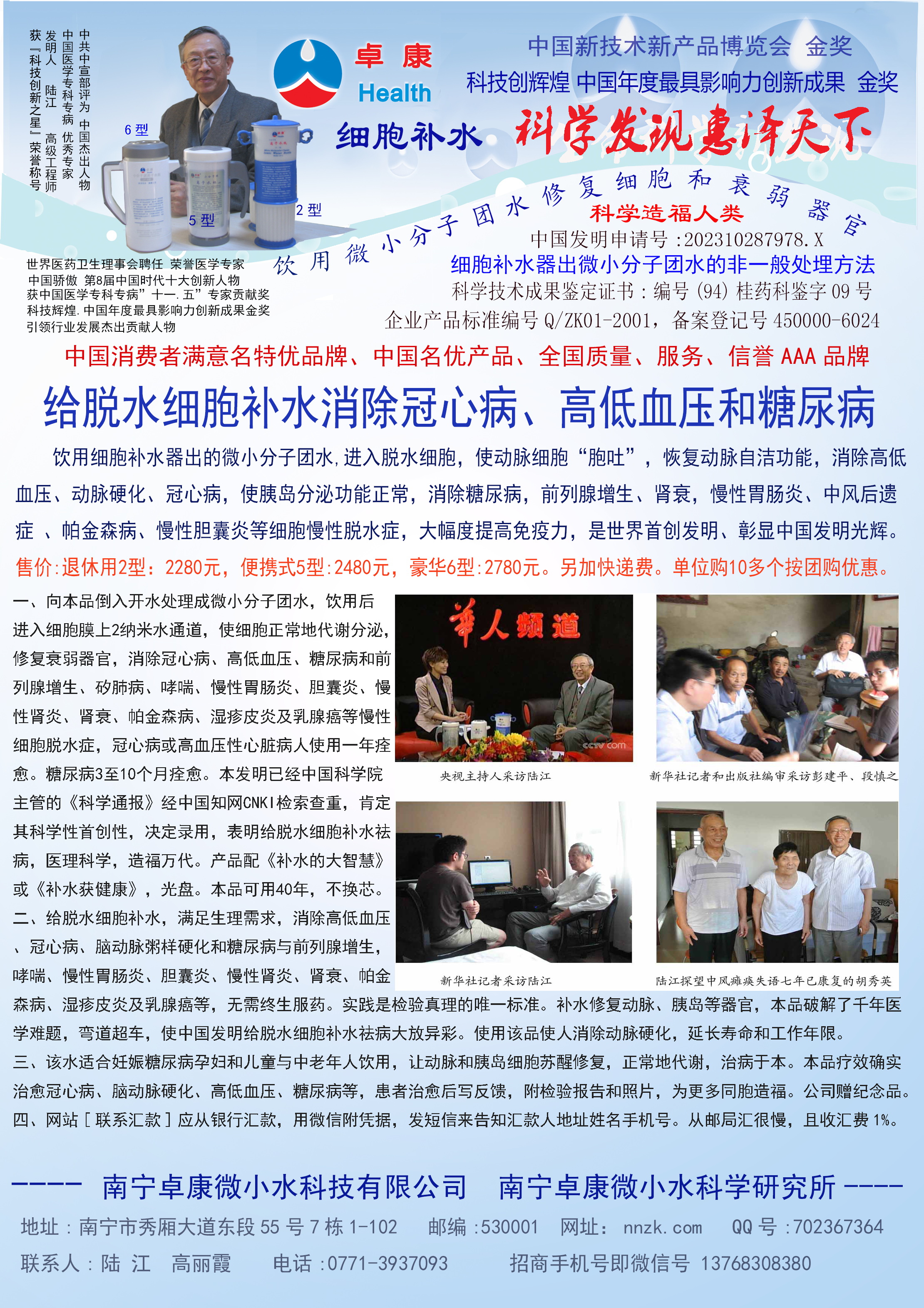 人類幾千年來患以上病癥需終生服藥,幾十年也不能治愈。可是我國南寧的高級工程師陸 江,于1990年想根治高血壓,研究發明了離子水瓶,處理出微小分子團水供飲用,經過醫院臨床試用和專家鑒定,1999年獲中國發明專利權,產品于2000年投放市場后一直跟蹤調查,據全國各地用戶反饋:祛除了高低血壓、糖尿病和冠心病,并使前列腺增生、咽喉炎、鼻竇炎、慢性氣管炎、支氣管炎、矽肺病、哮喘、慢性胃炎、腸炎、慢性膽囊炎、慢性腎炎、腎衰、膀胱炎、便秘、痔瘡、風濕性關節炎和濕疹皮炎及中風后遺癥等病癥不藥而愈。為什么喝微小水能治20多種???陸 江從1991年德國科學家發現細胞膜水通道僅為2納米獲得啟發,認為多種器官患病是因細胞脫水,不能正常代謝和分裂增殖,才使器官細胞減少致衰弱萎縮而形成細胞缺水性病癥。22年來的實踐有力地支持了“細胞脫水致病”這一重要論點,表明喝微小水可滿足細胞的生理需求,補水就能祛病,是生命科學新亮點。